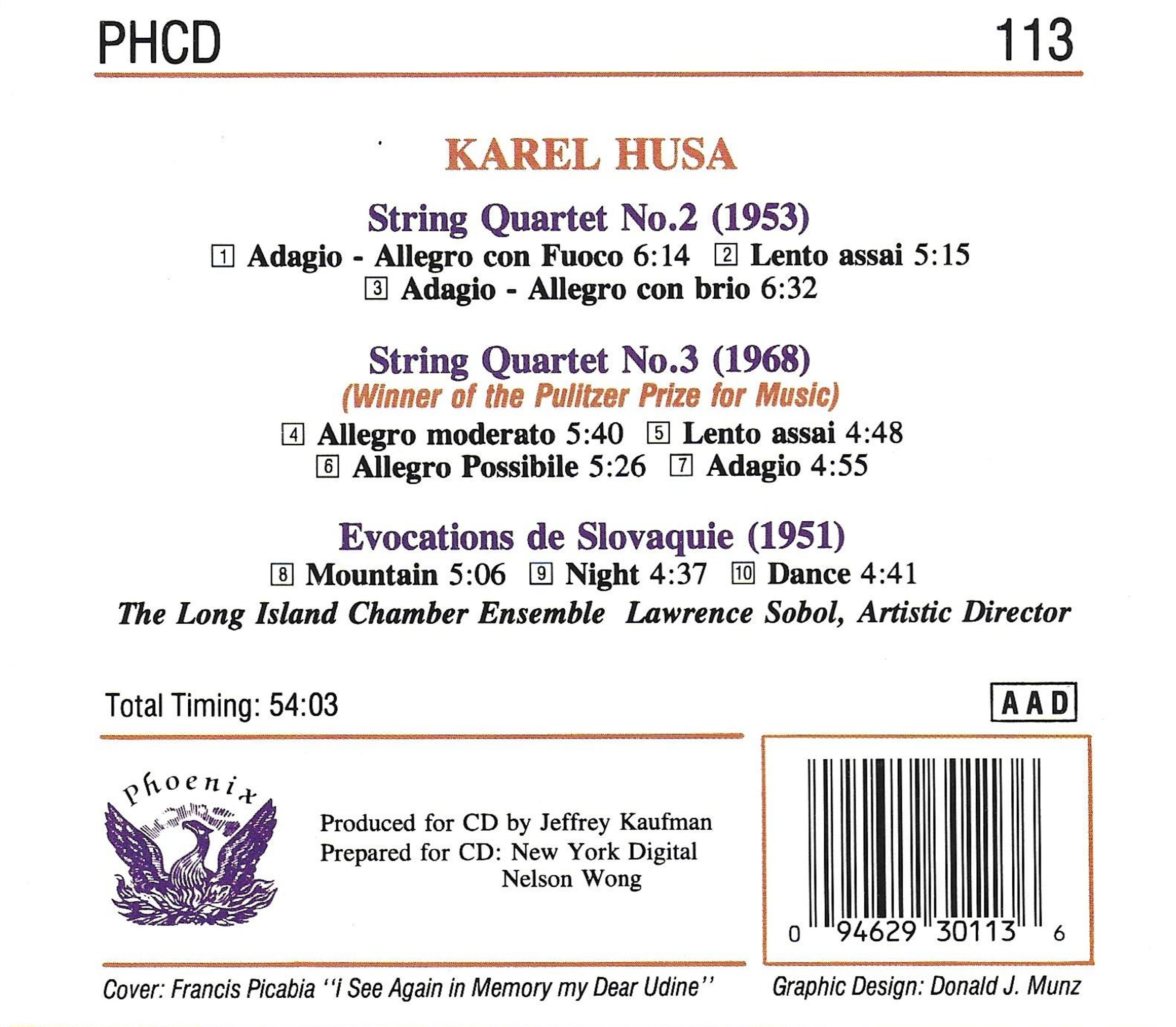 Karel Husa (b. 1921 in Czechoslovakia) has taught at Comell since 1954; he composed Evocations in about 1952, the Second Quartet in 1953, and the Third in 1968. In the booklet, the composer writes charming and well-deserved tributes to these players for performances heard before the recordings were made. In turn, the Fine Arts Quartet was so impressed with, and had such success playing his Second Quartet, that they commissioned the Third, which then won a Pulitzer Prize in 1969.