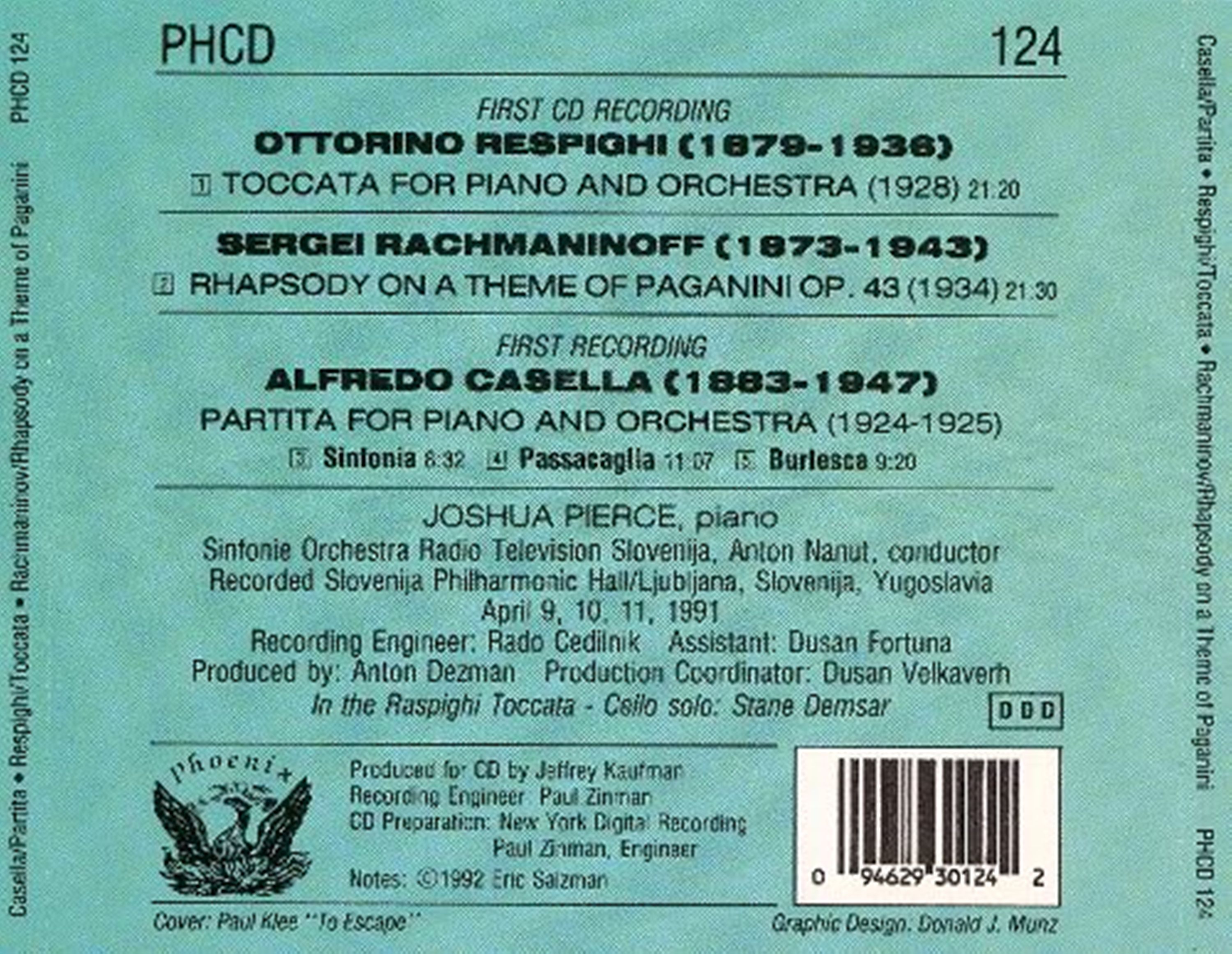 A comparably dry, detached, and deliberative approach is applied most fruitfully to that old late- Romantic virtuoso warhorse-the Rachmaninov Paganini Rhapsody (hence the “Italian Connection”), thus illuminating a whole new facet of the Russian composer by transforming the “rhapsody” into an example of the kind of variational neoclassicism which Eric Salzman pinpoints so well in his excellent annotation, and therefore enabling the Rachmaninov to fit right into this program of works all written within the same ten-year span (1924-34). All three performance on this Phoenix release are extraordinarily well meshed: Pierce and Nanut work together like a team of well-trained thoroughbreds, and the Yugoslavian engineers supply a matchingly sharp, vibrant close-up acoustics. Highly recommended.